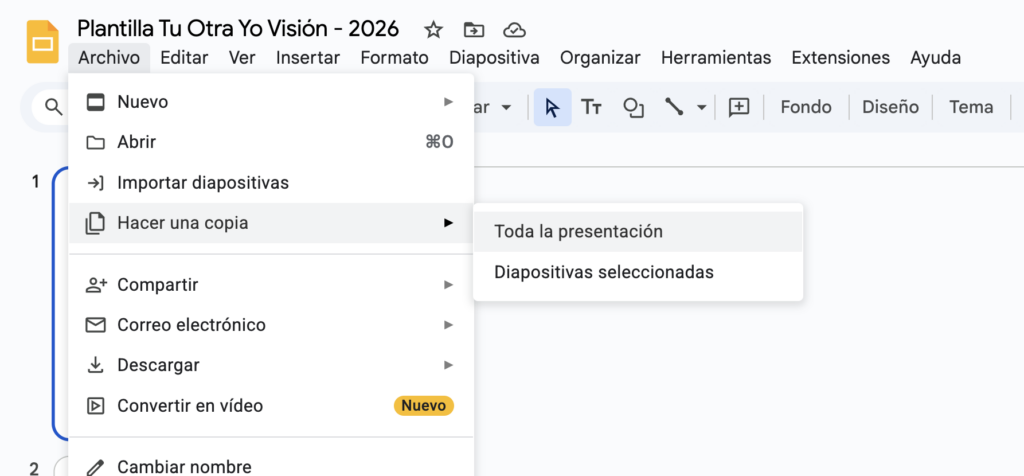 No puedes editar la plantilla, debes crear una copia. Clica en Archivo, luego en Hacer una copia, y luego en Toda la presentación. Te enseño aquí: